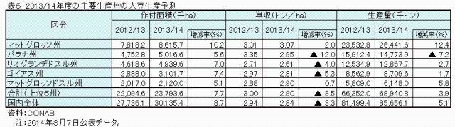 CONABでは、生産量の大幅な伸びが期待する地域として、これまでと同様に北東部を中心としたマトピバ地域を挙げている。同地域では、2013/14年度に作付面積が増加し、適度な降雨も記録したことで生産量が増加した。そのため、同年度の生産量は国内全体の生産量の約8%に相当する662万トン(同57.7%増)まで拡大するとみている。