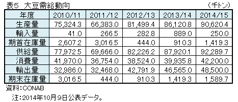 また、CONABは、これまで大幅な伸びを記録してきた新興農業開発地域であるマトピバ地域の2014/15年度の大豆生産量について、作付面積の拡大と単収増を受け、増加を見込んでいる。
