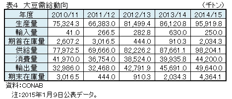 一方、大豆は、引き続き増産が予測されており、2014/15年度は、前年度比11.4%増の9592万トンと過去最高を更新する見込みである。この要因として、国際価格は下落しているものの、生産コストが低く、他の作物よりも収益性が高いことが挙げられている。