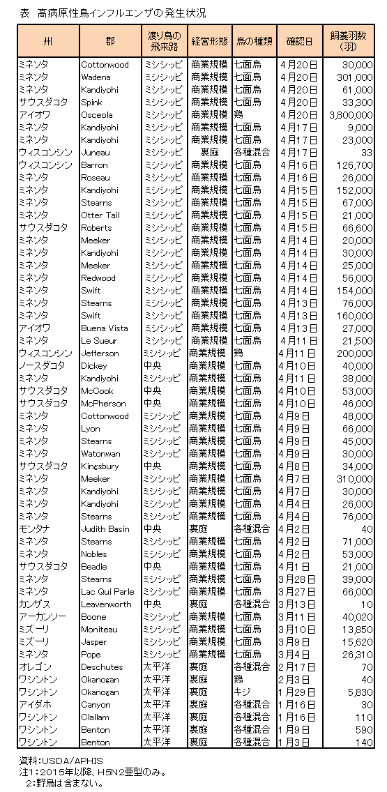 ・アイオワ州:商業規模の養鶏農場でHPAIの発生が確認された。同農場は、380万羽の採卵鶏を飼養しており、同州の飼養羽数5956万羽(2015年2月)の6.4%を占めている。また、同州の2014年の鶏卵生産量は164億4900万個(全国シェア16.5%)と全国最大の鶏卵生産地域であることから、鶏卵の供給量への影響が懸念される。