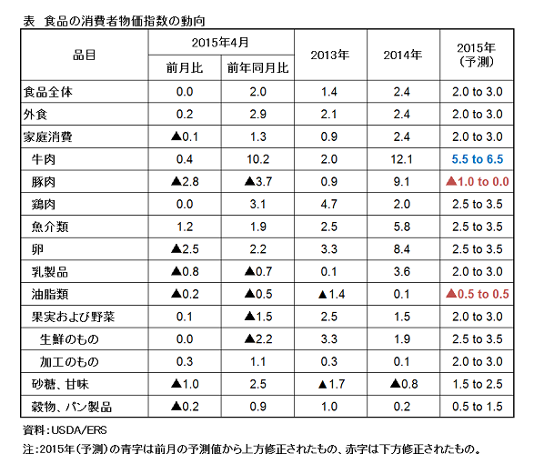 また、2015年の牛肉のCPIは、前月に公表された予測値から引き上げられ、前年比5.5%〜6.5%の上昇が見込まれている。一方、豚肉のCPIは、前月の予測値から引き下げられ、同1.0%の下落または前年並が見込まれている。