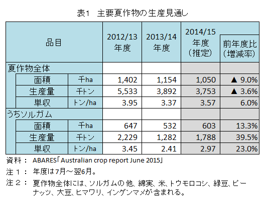 ABARESは、夏作物(10月〜翌1月にかけては種、3〜4月にかけて収穫)について、2014/15年度(7月〜翌6月)の生産見込みを発表した(表1)。