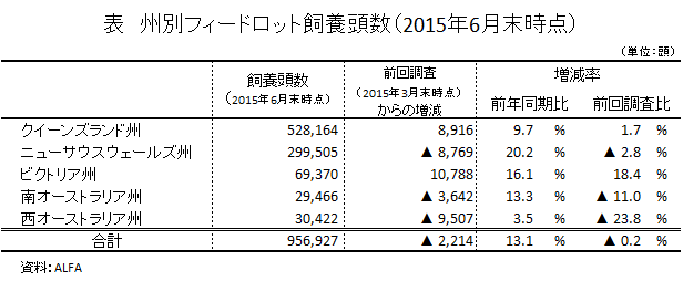 飼養頭数を州別に見ると、いずれの州でも前年同期比で増加しており、特にクイーンズランド(QLD)州とビクトリア州では、高水準であった前回調査時をさらに上回った(表)。
