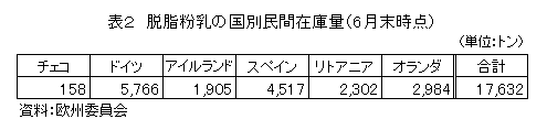 また、昨年のロシアによる禁輸措置を受けて発動された民間在庫補助では、2015年6月末時点で6カ国合計1万7632トンの脱脂粉乳が対象となっており、実施国は、チェコ、ドイツ、アイルランド、スペイン、リトアニア、オランダとなっている(国別内訳は下記表2の通り)。