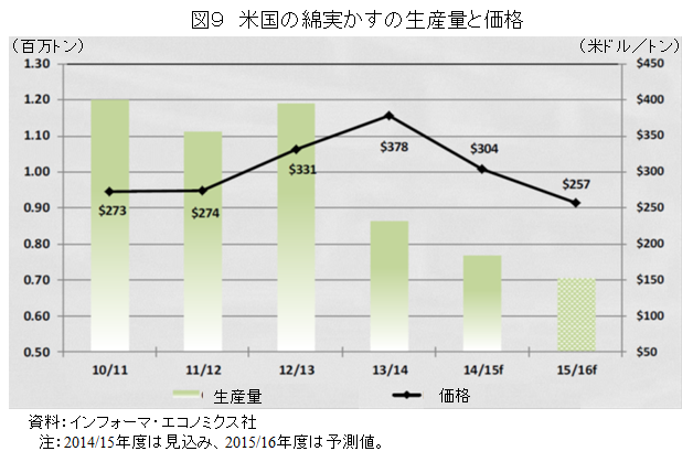 - 綿実については、降雨に恵まれたテキサス州西部で過去5カ年平均を上回る単収が期待できるものの、中南部で春先の降雨の遅れにより収穫面積が減少すること、南東部でも面積の減少が見込まれることから、2015/16年度の生産量は、前年度を下回る見込みである(図8)。