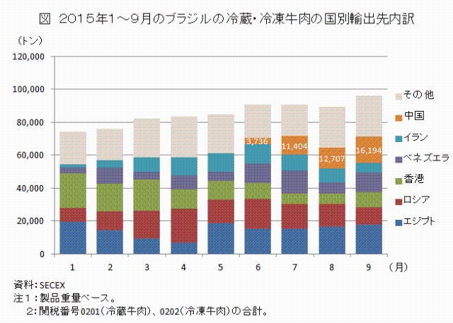世界最大級の牛肉輸出国であるブラジルは、2015年6月4日付で中国向け冷凍牛肉(2015年5月19日以降に生産され、骨を取り除いた30カ月齢以下のもの)の輸出が再開し、以降、同国向けは順調に増加している。