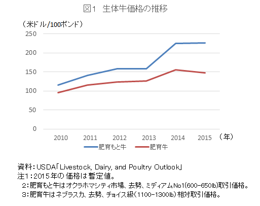 飼養頭数を種類別に見ると、肉用牛については、繁殖雌牛(経産牛)が同3.5%増の3033万頭、2017年以降の牛飼養頭数に影響してくる繁殖後継牛も、同3.3%増の629万頭となった。これは、肥育もと牛の価格が2015年の特に前半まで堅調に推移し、生産者の生産意欲を刺激したためと考えられる(図1)。