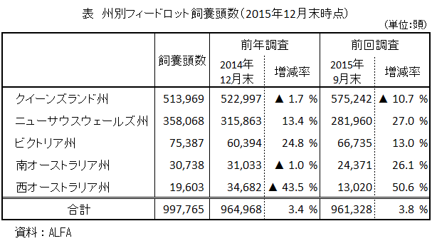ALFAは、フィードロット飼養頭数の増加について、2015年10〜12月にかけて、前年同期比16%安と米ドルに比べて豪ドル安で推移する為替レートや、同10%近く安い豪州国内の飼料穀物価格を受け、肥育もと牛導入意欲が高まったことが背景にあるとしている。こうしたもと牛導入意欲の高まりを受け、10〜12月期のQLD州の肥育もと牛価格は、前年同期比31.4%高と大幅に上昇した。今後の見通しについて、MLAは、肥育もと牛価格の高騰や、穀物肥育牛に対する需要の高さを受け、と畜頭数が増加し、フィードロット飼養頭数は減少に転じるとしている。
