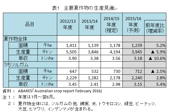 また、生産量の過半を占めるソルガムの作付面積は、71万2000ヘクタール(同2.5%減)と、主要生産州であるクイーンズランド(QLD)州において、12月の降雨が平年を下回ったことが影響し、前年度を下回ると見込まれている。一方、生産量は、224万トン(同2.8%増)と、2月以降、平年を上回る降雨により、単収の増加が予測されていることから、前年度を上回ると見込まれている。