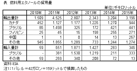 2015年は、特に中国への輸出量が増加したが、これは同国で穀物からのエタノール生産に対する支援策が終了したことで、オクタン価向上のための添加剤として米国産エタノールの価格競争力が出たためとみられる。
