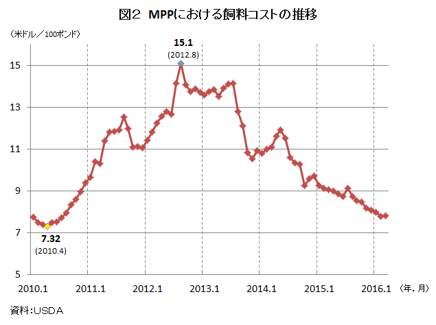 なお、USDAは、MPPマージンは今年の夏にかけて6米ドル付近まで下がり、その後、年末にかけて8米ドル以上の水準に戻ると予測している。