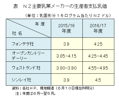 また、現地報道によると、南島に拠点を置く乳業メーカーであるシンレイ社は、2016/17年度の生産者乳価の支払見込みについて、既に発表したフォンテラ社よりも0.25NZドル(19円)高い、乳固形分1キログラム当たり4.50NZドル(347円)とするとしている。さらに、NZ第2位の規模を誇るオープンカントリーデーリーも、同4.25〜4.45NZドル(327円〜343円)とするとしている(表)。
