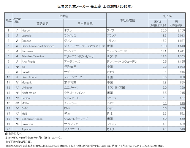 オランダの農協系金融機関ラボバンクは、2015年の世界主要乳業メーカー売上高ランキングを発表した。