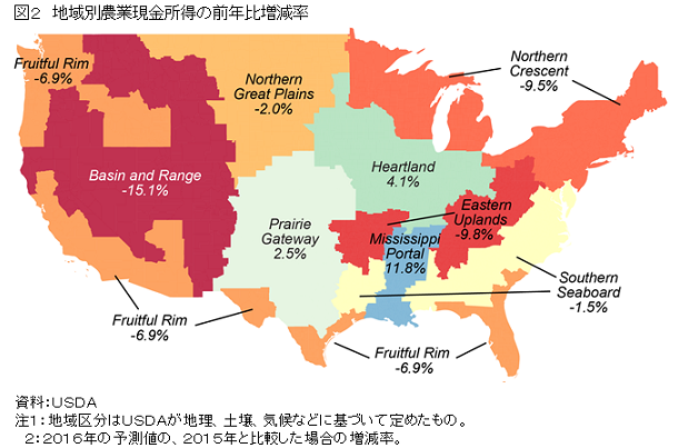 また、農業現金所得について、USDAが定めた地域区分ごとにみると、主要肉用牛生産州であるコロラド州やアリゾナ州を部分的に含むベイスンアンドレンジ(注3)(Basin and Range)や、乳牛飼養頭数が全米2位のウィスコンシン州などを含む東北部の酪農地帯であるノーザンクレセント(注4)(Northern Crescent)などでは、前年をかなり下回ると見込まれている。一方、価格が比較的堅調に推移した綿花やコメの生産が盛んなミシシッピ川下流域のミシシッピポータル(注5)(Mississippi Portal)では、前年を11.8%上回ると見込まれている。また、コーンベルトに位置するハートランド(注6)(Heartland)では、豊作であった穀物などの収入が増加することにより、前年比4.1%増と見込まれている(図2)。
