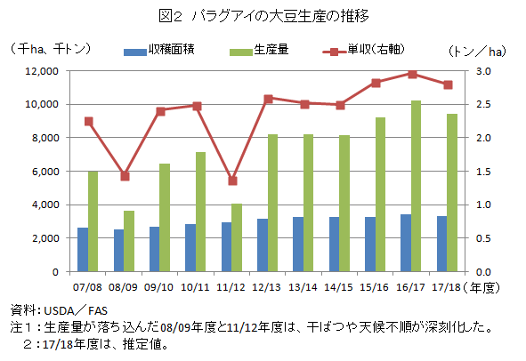 2016/17年度(3月〜翌2月)の大豆生産量は、収穫面積が拡大した上、天候に恵まれて高単収を記録したことから、前年比10.9%増の1020万トンと過去最高を記録した(図2)。