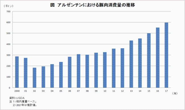 図の通り、アルゼンチンの豚肉消費量は2003年以降、一貫して増加傾向で推移しており、1人当たり豚肉消費量についても、2016年には13キログラムと、牛肉の約4分の1、鶏肉の約3分の1にすぎないものの、2011年と比べ50%以上増加した。同国は豚肉消費量の約9割を自給しているが、豚肉輸入量は2014年以降増加傾向で推移している。2016年は2万5708トン(製品重量ベース)であり、ブラジル産が大半を占めた。