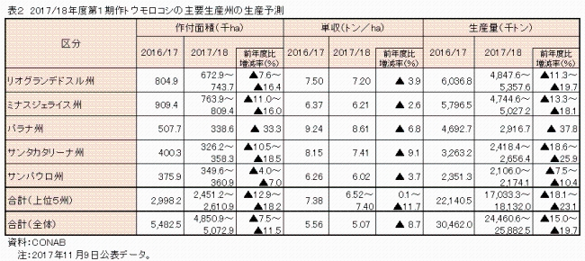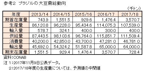 ブラジル国家食糧供給公社(CONAB)は11月9日、2017/18年度(10月〜翌9月)第2回目となる主要穀物の生産状況等調査結果を公表した。当該調査は、春植えの夏期作物(大豆、第1期作トウモロコシなど)と、秋植えの冬期作物(第2期作トウモロコシ、小麦、大麦、ライ麦など)の生産予測を毎月公表するものである。