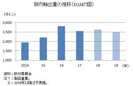 欧州委員会は、これらの頭数増加を踏まえつつも、輸出市場での競争の激化により豚価が下落する可能性を考慮し、2018年の豚枝肉生産量を同0.8%増の2388万トン程度と見込んでいる。さらに、2019年については、豚価の低迷が継続すると予想しており、前年比0.4%減の生産量を見込んでいる。