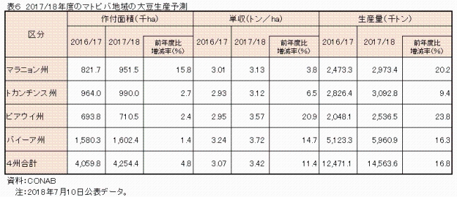 マトピバ地域の大豆生産量は、前年度比16.8%増の1456万3600トンと2年連続で増加が見込まれている(表6)。特に、マトピバ地域の最大生産州であるバイーア州では、良好な天候により単収が大幅に回復したことから、生産量は同16.3%増と、前回報告から5.6ポイント上方修正された。