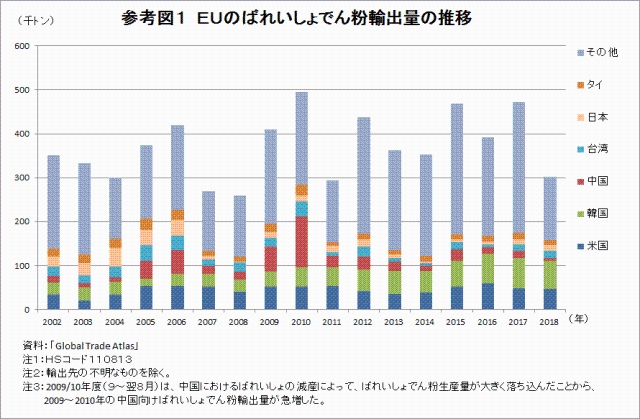 2019年2月19日に中国商務部は、公告2019年第4号により、EU産ばれいしょでん粉に対するアンチダンピング措置をさらに5年間継続することを公表した。商務部によって実施された調査で、この措置を終了した場合、中国国内のでん粉産業が損害を被るとされたためである。これにより、EU産ばれいしょでん粉に対して、12.6〜56.7%のアンチダンピング税が継続して課せられることとなった。この措置は2007年から2度にわたり更新されており、昨年、見直しが行われることが発表されたが、今回、さらに継続となった。