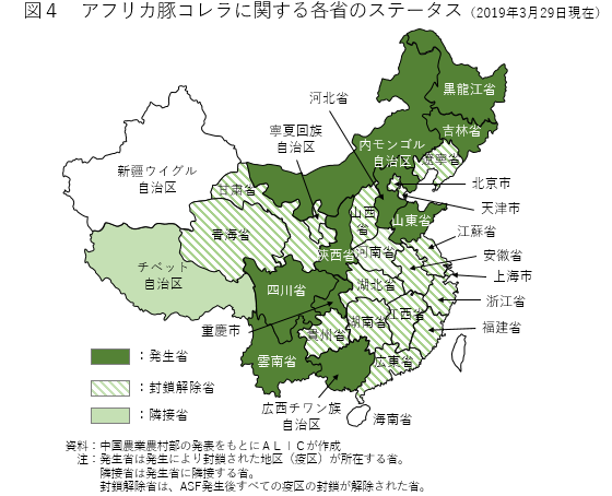 中国では、引き続き多くの省でアフリカ豚コレラが発生している(図4)。2019年3月29日時点で、直近では、3月21日に重慶市での発生が公表されている。
