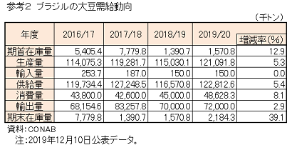 ブラジル国家食糧供給公社(CONAB)は12月10日、2019/20年度(10月〜翌9月)第3回目となる主要穀物の生産状況等調査結果の要約版を、同19日に州ごとの分析や細かい講評を加えた完全版を公表した。当該調査は、春植えの夏期作物(大豆、第1作トウモロコシなど)や秋植えの冬期作物(第2作・第3作トウモロコシ、小麦、大麦、ライ麦など)の生産予測を毎月公表するものである。これによると、穀物合計では作付面積、単収がともに前年度を上回る見込みから、生産量も前年度を上回る見込みとなった(表1)。