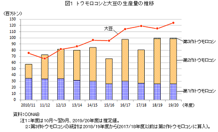 トウモロコシの生産量は、第1〜3作トウモロコシの単収がいずれも減少するものの、作付面積が前年を上回ることから、過去最高となった前年と同程度となる見込みとなった(図1)。また、大豆については、作付面積および単収の増加が続いていることから、過去最高を更新する見込みとなった。5回連続で増加見込みとなっており、さらに記録を更新する見込みとなっている(図2)。