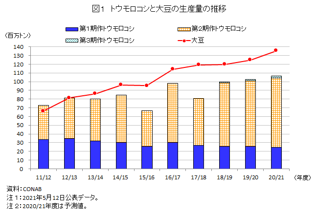 ブラジル国家食糧供給公社(CONAB)は5月12日、2020/21年度第7回目となる主要穀物の生産状況等調査結果を公表した(表、図1、2)。この調査は、春播きの夏作物(大豆、第1期作トウモロコシなど)や秋播きの冬作物(第2期作・第3期作トウモロコシ、小麦、大麦、ライ麦など)の生産予測を毎月公表するものである。