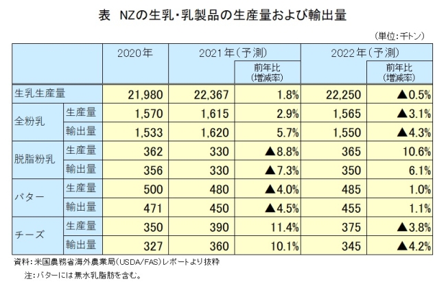 米国農務省海外農業局(USDA/FAS)は10月15日、2022年のニュージーランド(NZ)の生乳および乳製品の需給予測を公表した。