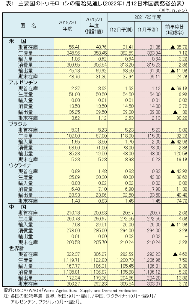 米国農務省世界農業観測ボード(USDA/WAOB)および米国農務省海外農業局(USDA/FAS)は2022年1月12日、2021/22年度の世界のトウモロコシ需給予測値を更新した(表1)。