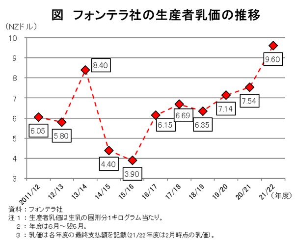 ニュージーランド(NZ)最大の酪農協系乳業メーカーであるフォンテラ社は2月24日、2021/22年度(6月〜翌5月)の生産者支払乳価を、生乳の固形分(注1)1キログラム当たり9.60NZドル(761円:1NZドル=79.27円(注2))に引き上げると発表した。前回公表時(2022年1月25日)から同0.40NZドル(32円)の上乗せとなり、同社の生産者支払乳価としては過去最高水準となる。