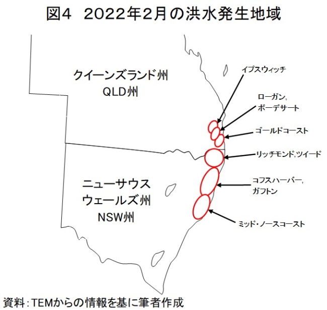 豪州では、2年連続となるラニーニャ現象が要因となり、東海岸沿いを中心に2022年2月下旬から断続的に大雨が降り(図1)、20人以上の死者を出す洪水災害が発生している。3月中旬にいったん大雨は収束するかに見えたものの、同月下旬にも再度大雨が降り、リズモア(ブリスベンから南に約200キロメートル)などの一部地域で洪水被害が発生している。