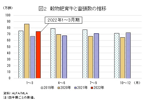 また、当期(22年1〜3月期)の穀物肥育牛と畜頭数は、74万2323頭(前年同期比11.5%増、前回比2.2%増)となり、5期連続で増加した(図2)