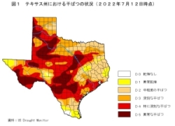 米国南西部の干ばつが深刻化している。米国農務省(USDA)によると、カリフォルニア州やアリゾナ州などの西部、テキサス州やアーカンソー州などの南部の牧草地の状態が「非常に悪い」または「悪い」と評価されている。特に、テキサス州では猛暑が続いており、米国農務省全国農業統計局(USDA/NASS)によると、7月10日時点で同州の牧草地の83%が「非常に悪い」または「悪い」状態であると評価された。