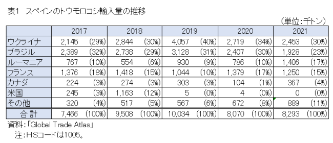 EU統計局によると、スペインは過去5年間に毎年747万〜1003万トンのトウモロコシを輸入しており、うちウクライナからの輸入量は同215万〜406万トンと輸入量全体の29〜40%を占めている(表1)。ウクライナのほかにブラジル、ルーマニア、フランスなどからもトウモロコシを輸入し、輸入先を分散しているものの、約30%のシェアが失われる影響は大きい。