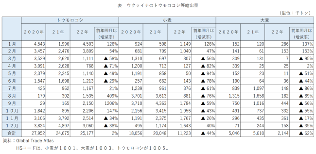 ウクライナ国税庁の月別輸出統計によると、2022年のトウモロコシ輸出量はロシアの侵攻の最中にもかかわらず前年をわずかに上回る2518万トンとなった(表)。これは、黒海穀物イニシアティブおよび連帯レーン