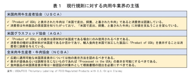 このような中、米国肉用牛生産者協会(USCA)、米国グラスフェッド協会(AGA)、全米肉牛生産者・牛肉協会(NCBA)などの肉用牛業界団体から現行規則の改正を要望する声が上がっていた(表1)。