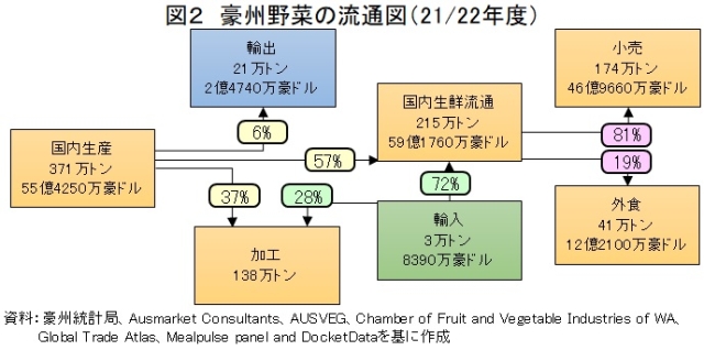 園芸品目のうち野菜に注目すると、直近の21/22年度の野菜産業全体の流通取引総額は177億900万豪ドル(1兆6112億円、前年度比13.2%増)とかなり大きく増加している(表、図2)。