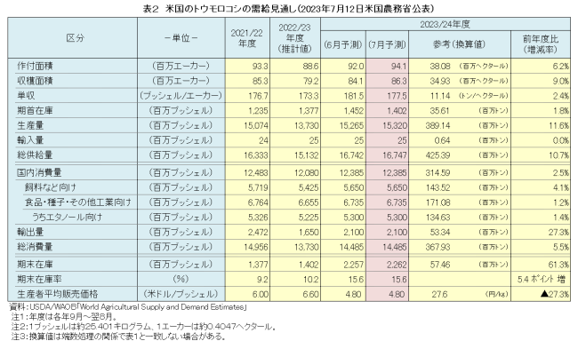 USDA/WAOBは併せて、2023/24年度(9月〜翌8月)の米国のトウモロコシ需給見通しを公表した(表2)。