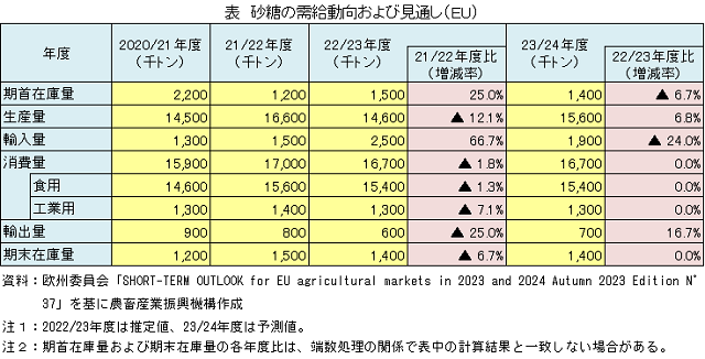 欧州委員会は2023年10月9日、EU農畜産物の短期的需給見通し(注1)を公表した。このうち、砂糖の需給見通しの概要について紹介する。