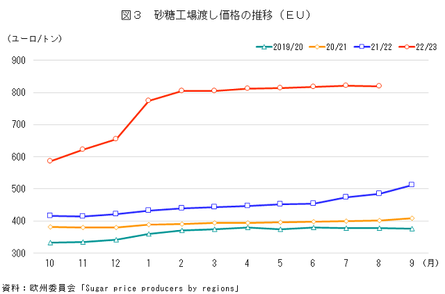 23年8月時点のEU域内の砂糖価格は、1トン当たり819ユーロ(13万631円:1ユーロ=159.50円(注2)、前年同月比74.0%増)と引き続き高い水準で推移している(図3)。