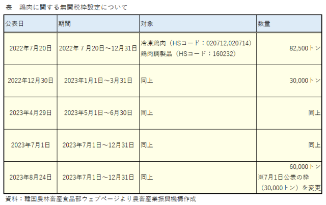 この記録的な輸入量増加の背景としては、22年7月からたびたび実施されている鶏肉輸入に関する関税率の引き下げが影響しているとされる。韓国農林畜産食品部は22年7月20日、飼料価格および鶏肉価格の高騰に対応し、消費者への安定供給を確保することを目的に、同年末までの期間を対象として8万2500トンの鶏肉無関税輸入枠(注1)の設定を公表した。この取り組みは同年末に一度区切りを迎えたが、その後も同年12月30日付で翌23年1月1日〜3月31日までの期間に3万トン、4月28日付で同年5月1日〜6月30日までに3万トン、7月1日付で同年7月1日〜12月31日までに3万トンの無関税輸入枠が断続的に設定された。また、8月24日付で12月末までの上記無関税輸入枠が6万トンに拡大された(表)。
