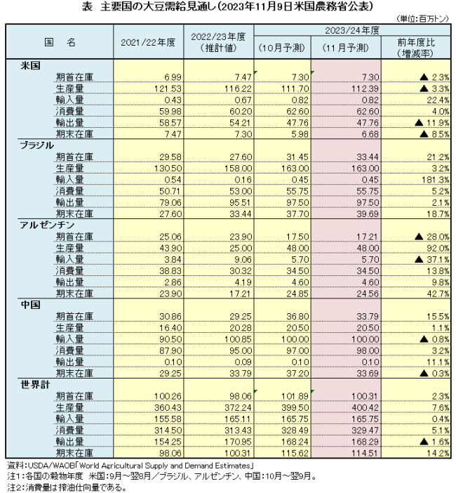 米国農務省世界農業観測ボード(USDA/WAOB)および米国農務省海外農業局(USDA/FAS)は2023年11月9日、2023/24年度の世界の大豆需給予測値を更新した(表)。