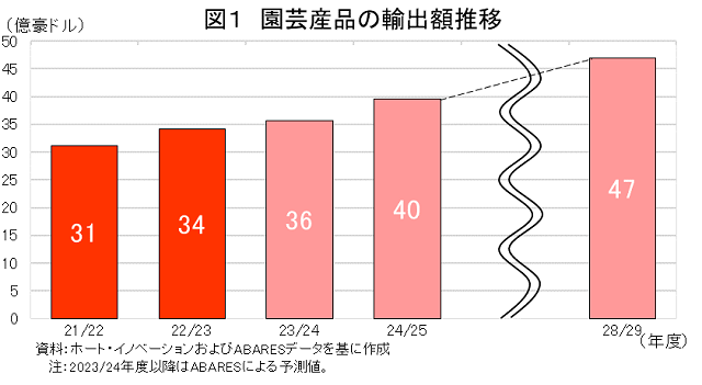 また、ABARESの報告によると、園芸産品全体の輸出額は、気象条件の改善とかんがいによる効率的な水資源の利用による生産量の増加に加え、果樹やナッツ類を中心とした国内外の需要拡大により、24/25年度には40億豪ドル(3995億円、前年度比11%増)、28/29年度には47億豪ドル(4694億円、24/25年度比18%増)の増加が見込まれている(図1)。