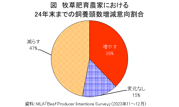 この結果を見ると、24年末までの飼養頭数に関し「増やす」と回答した農家は全体の38%となり、「減らす」と回答した農家の47%を下回った(図)。「増やす」と回答した農家の理由として、一定の降雨による牧草確保の可能性のほか、肉牛取引価格の上昇見通しを挙げており、このうち44%の農家は長期的な規模拡大計画を進めているとしている。一方、飼養頭数を「減らす」と回答した農家の理由として、今後の乾燥気候による牧草確保の困難性や、肉牛取引市場の見通しの不安定さに加え、生産コストの増大や他の農作物への転換、健康上の問題、廃業などを挙げている。