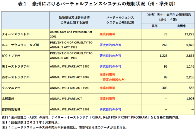豪州では、動物福祉に対する立法責任は州政府および準州政府にあり、それぞれの州・準州で動物福祉または動物虐待の防止に関する法律が規定されている。このことから、VFシステムの使用の可否については、各州・準州の判断となっており、現時点では、クイーンズランド州、タスマニア州、西オーストラリア州および北部準州での商業利用が可能となっている(表1)。