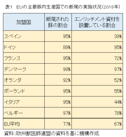 18年に断尾の実施状況を調査した欧州獣医師連盟(FVE)と欧州豚健康管理協会(EAPMH)は、段階的に断尾を廃止していくことを提案しており、22年には、欧州食品安全機関(EFSA)が適切な飼養管理がされている場合には、断尾は必要ないとする意見書を発表し、断尾を行うべきではないとする見解を示していた。