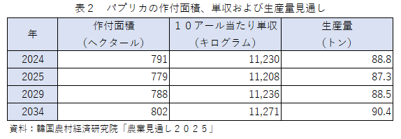 パプリカは、これまで日本向け輸出や国内需要の拡大で生産量を伸ばしてきた。しかし、冬作型を行う小規模生産者を中心にきゅうりやトマトへの作付け転換や、夏作型における労働力不足により、2025年の作付面積は、前年をわずかに下回る779ヘクタールと見込まれている。このため、生産量も前年をわずかに下回る8万7300トンと見込まれている。