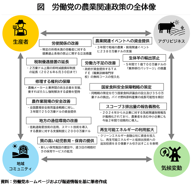 今回の総選挙では、所得税減税や学生ローンの20%削減、医薬品価格の引き下げなど、労働党が打ち出した一連の生活費高騰対策が争点となり、アルバニージー首相はこれらの政策に国民の合意が得られたとして、選挙当日に勝利宣言を行っている。また、中国市場へのアクセス再開など、貿易における実績が支持を得たとし、農業関係でもさまざまな施策を公約している(図)。一方で、生体羊の輸出禁止
