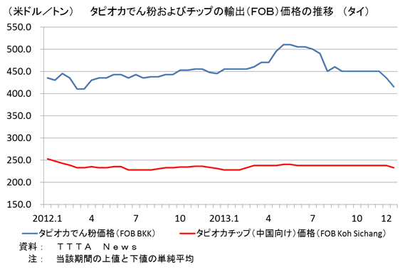 TTTAによると、12月後半はコメの収穫終了に伴い、キャッサバの本格的な収穫期を迎えたことで、市場への供給は増加傾向にあり、キャッサバ国内価格は下落傾向にあるとしている。また、タピオカでん粉FOB価格は、キャッサバ国内価格の下落およびタイの政局不安などによるタイバーツ安により、値下圧力が高まっていると見られる。